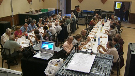 Espectáculo de humor con el showman, humorista e imitador de voces de famosos Miguel Ángel Lordán y el cantante de versiones musicales Arturo Portolés en la Fiesta de los jubilados en La Cartuja de Monegros (Huesca).