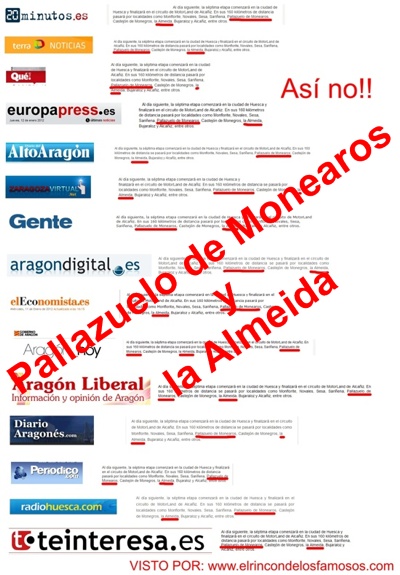 Y es que señores: «Pallazuelo de Monearos» no existe y «la Almeida», a no ser que sea una tal Cristina tampoco. Lo correcto es Pallaruelo de Monegros y La Almolda.